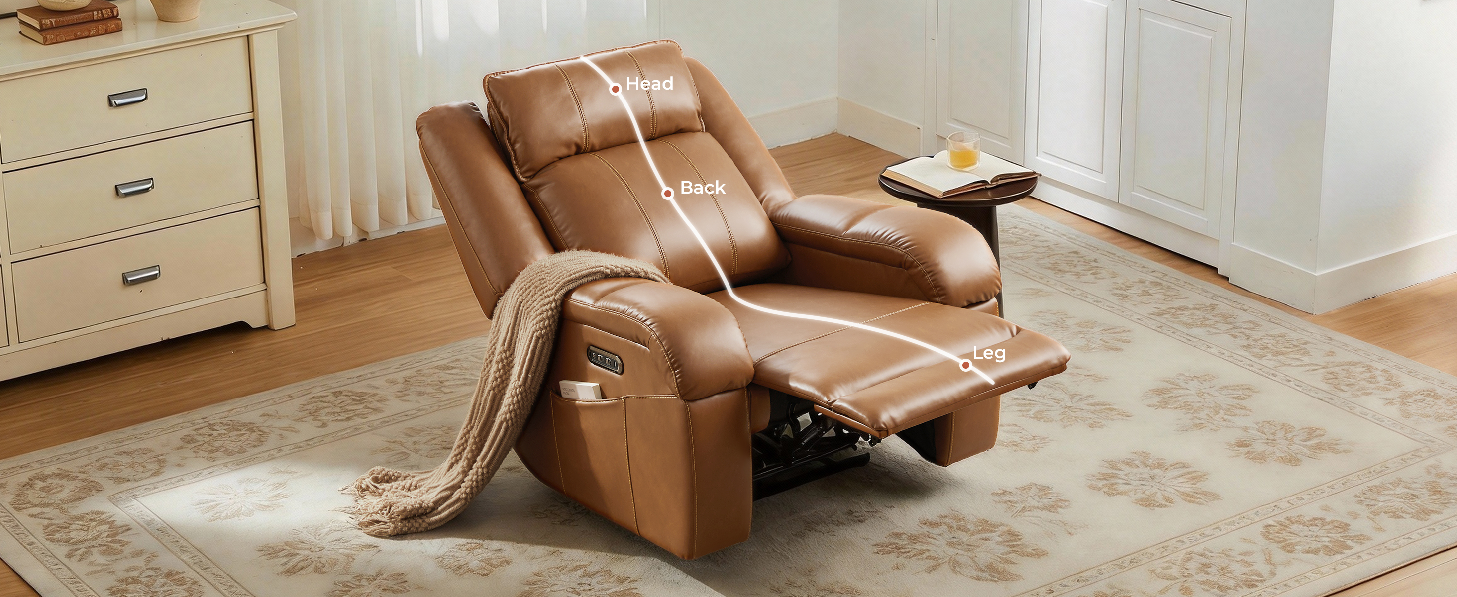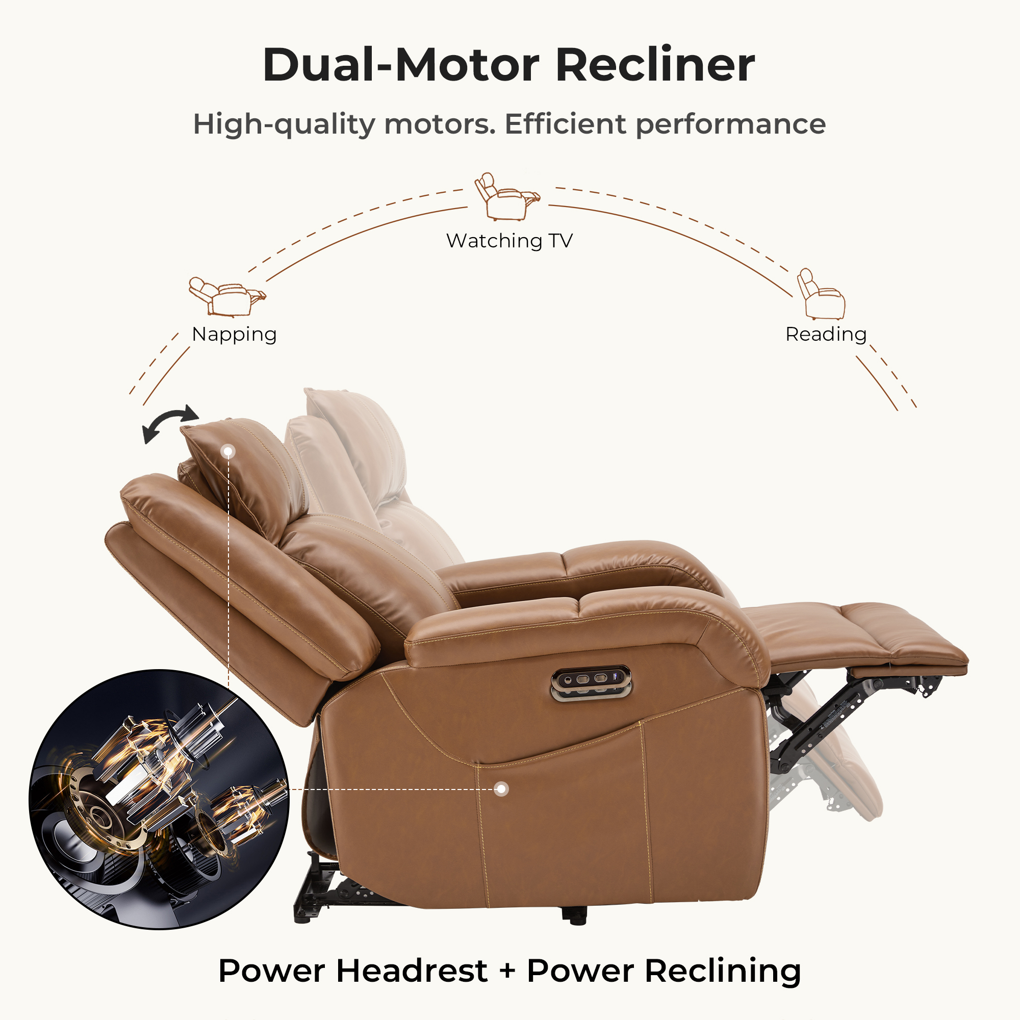 The recliner features dual motors, allowing independent adjustment of the reclining function and power headrest for a fully personalized experience. Whether leaning back or finding the perfect head and neck position for reading or watching TV, this recliner adapts to your needs.